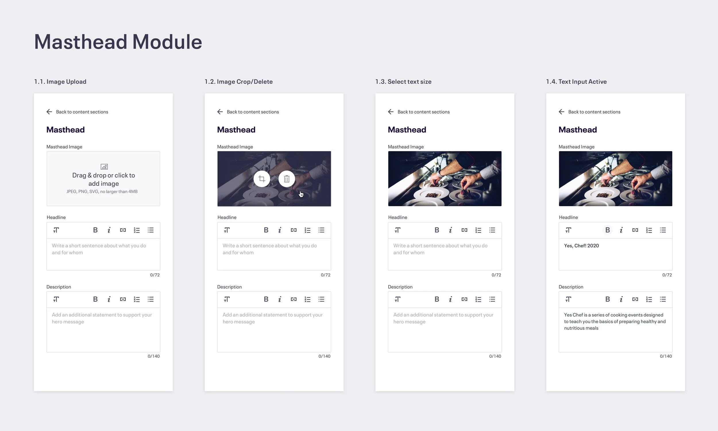 Potentially harder to use than inline (navigating to the content panel and correlating between live preview and input fields) - this could be mitigated with the user of hover states and overlays.